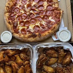 This pizza joint will deliver to your room in Vegas. A huge plus! Most places make you meet them outside the hotel. Weekends are slow but they'll deliver. The pizza is super greasy but hungry beggars on a late Vegas night can't be choosy. The price is decent for Vegas where everything is marked up. One large Pepp with fries and a dozen wings was $32. Not bad at all for Vegas. The delivery to your room is very nice after your DONE! A long walk to get your drunk dinner is no bueno. So 4 stars for greasy drunk food delivered to your drunk door.